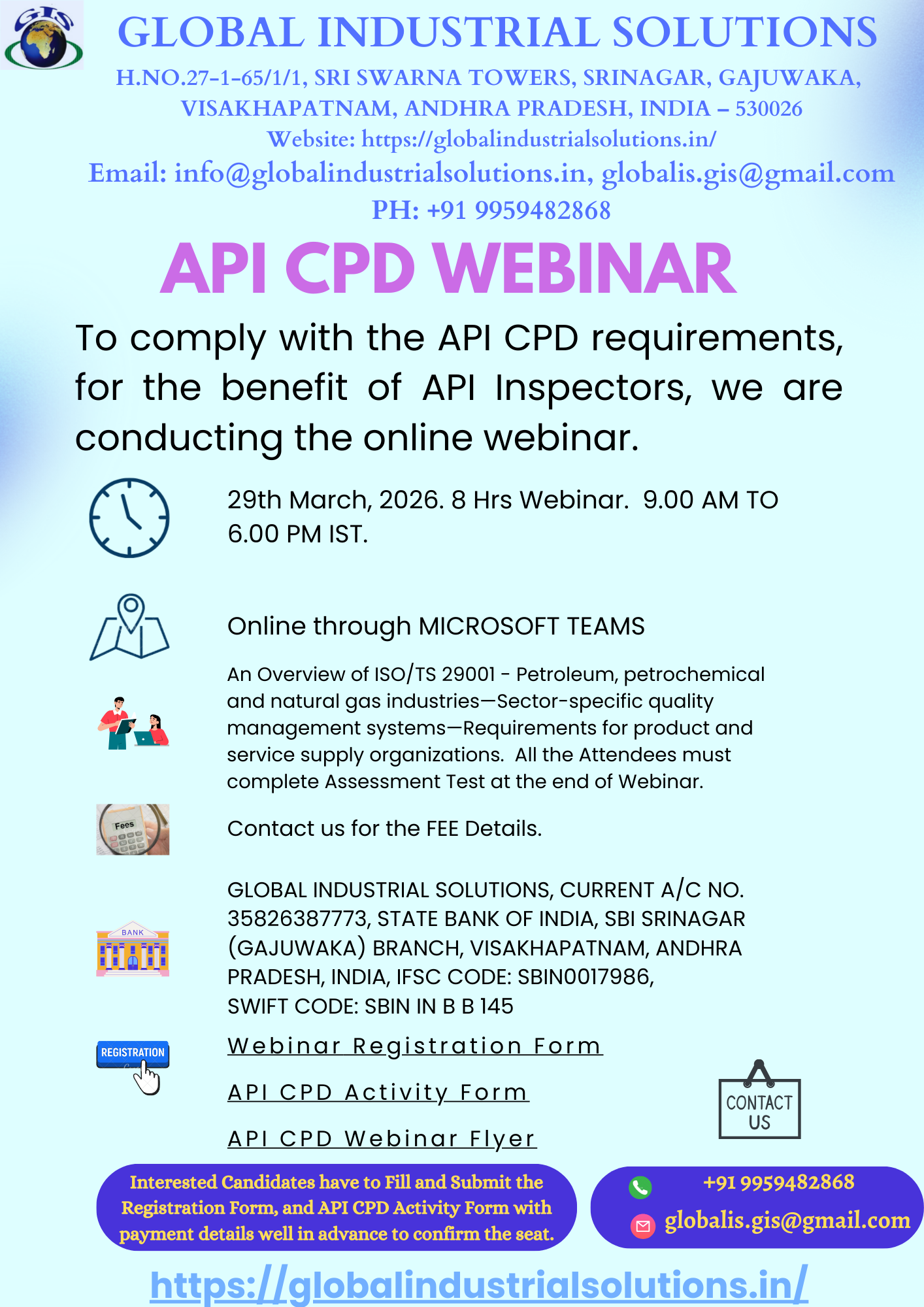 Global Industrial Solutions is a renowned name for Quality Training in the Industry. Serving the Industry for the past several years, GIS is conducting Webinars on various Industry Related Topics as per the API CPD Requirements stipulated by API.